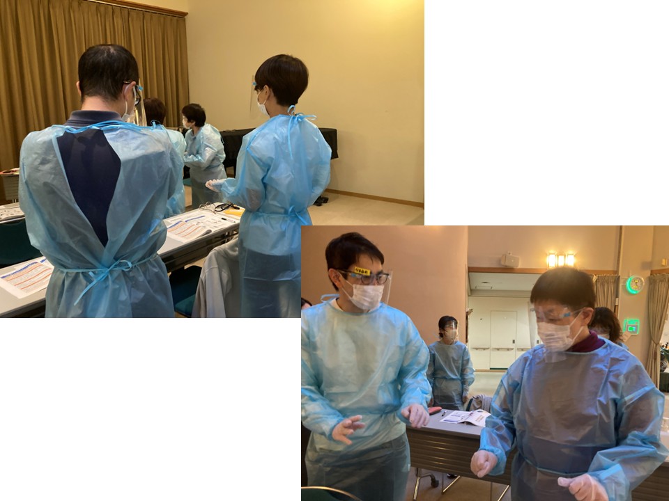 基本的な感染対策の知識について東京都の福祉局の方から座学や実技を丁寧に教えていただきました。ガウン脱着時のポイントや、フェイスシールド、ゴーグル脱衣時のポイントなども手順やタイミングを教わりました。