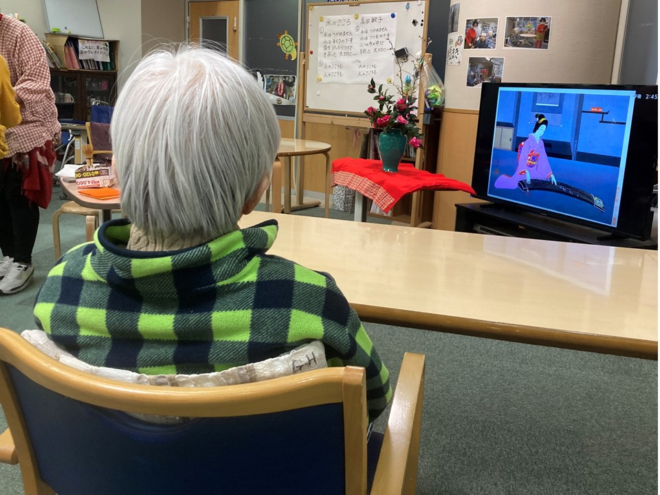 職員が椿の花を飾り、お琴の音色を流しながらお茶を点てました。